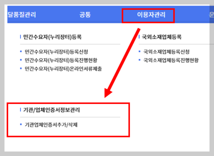 - 경로: 이용자관리 → 기관/업체인증서 정보관리 → 기관업체인증서 추가/삭제
