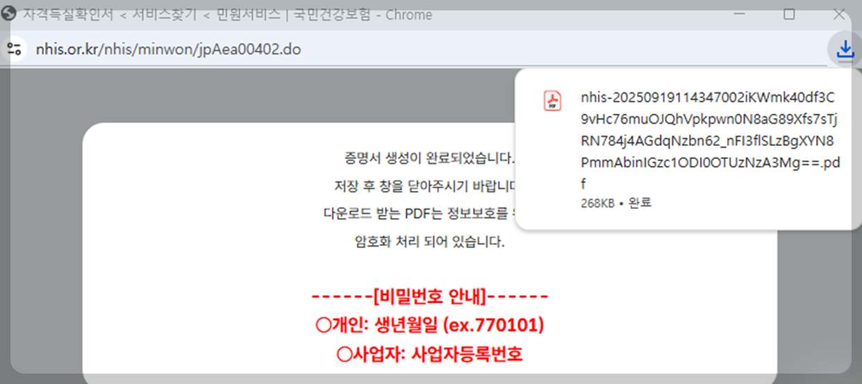 PDF로 저장 시 파일명은 건강보험자격득실확인서_날짜.pdf 형태로 저장됩니다.