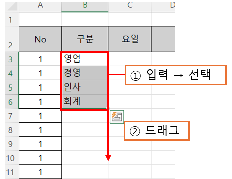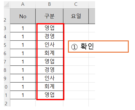 - 먼저 반복할 데이터 범위를 입력합니다. 예를 들어 B3~B6에 영업, 경영, 인사, 회계 순으로 입력합니다.
