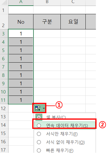 3. 드래그를 마친 후 나타나는 자동채우기 옵션 버튼을 클릭하고, 연속 데이터 채우기를 선택합니다.
