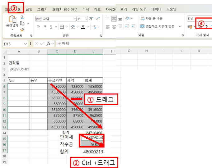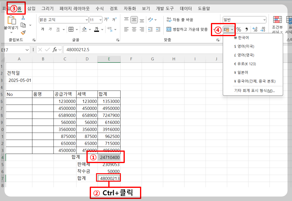 - [홈] 탭 → [표시 형식] 그룹에서 회계 표시 형식(₩) 아이콘을 클릭합니다.