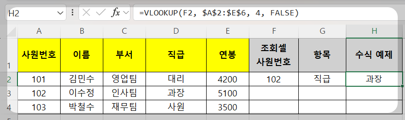 =VLOOKUP(F2, $A$1:$E$6 , 4, FALSE) → 직급