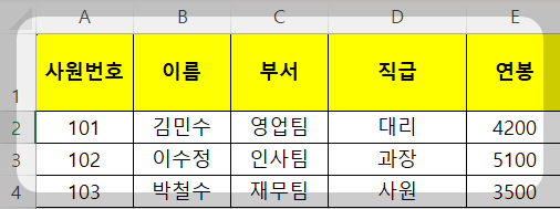- 시트1: 인사 관리 (사원번호 → 부서명/직급/연봉)