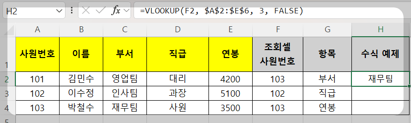 =VLOOKUP(F2, $A$2:$E$6, 3, FALSE) → 부서명