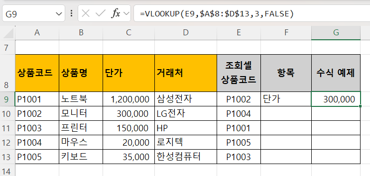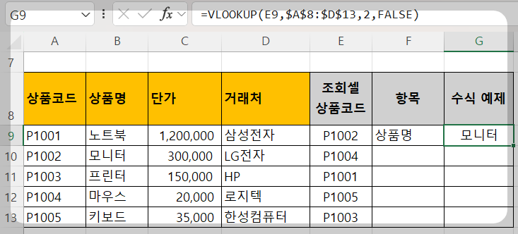 =VLOOKUP(E9, $A$8:$D$13, 2, FALSE) → 상품명