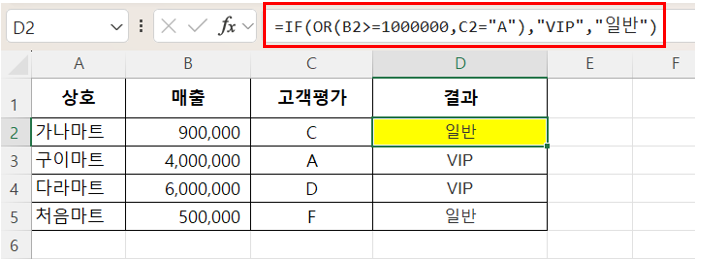 =IF(OR(B2>=1000000,C2="A"),"VIP","일반")