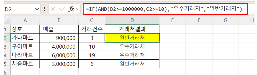=IF(AND(B2>=1000000,C2>=10),"우수거래처","일반거래처")